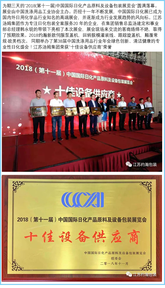 江蘇湯姆集團亮相中國國際日化展,并榮獲“十佳設備供應商”榮譽