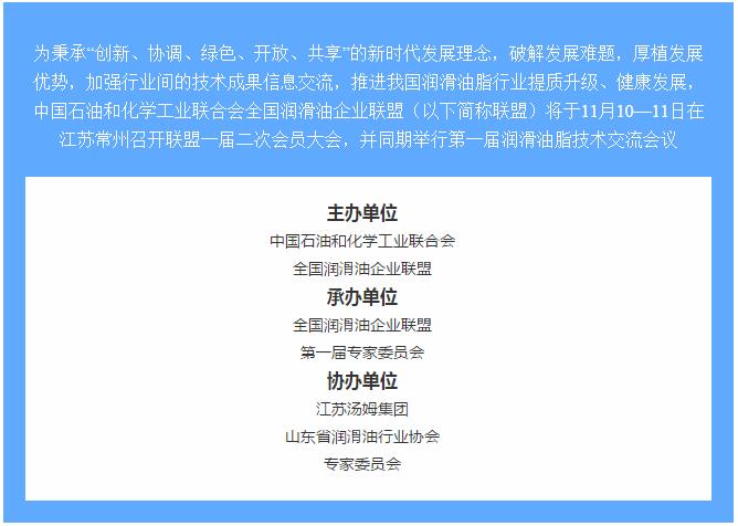 會(huì)議邀請(qǐng)丨江蘇湯姆集團(tuán)協(xié)辦全國(guó)潤(rùn)滑油企業(yè)聯(lián)盟一屆二次會(huì)員大會(huì)暨 第一屆潤(rùn)滑油脂技術(shù)交流會(huì)
